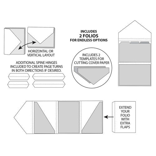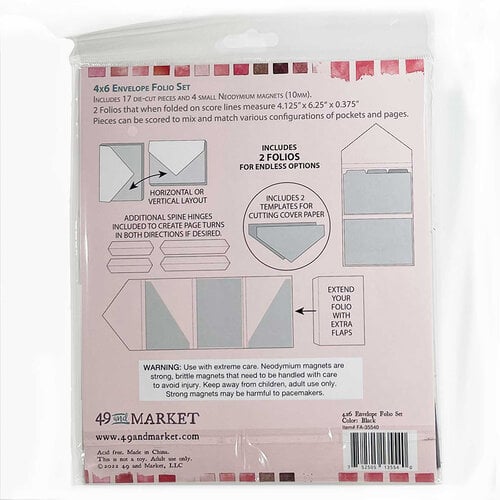 This package includes a 4" x 6" Envelope Folio Set in black that is part of the Foundations Collection from 49 and Market. This envelope set includes 17 die cut pieces and four small Neodymium magnets. This kit makes two folios that when folded on score lines measures 4.125" x 6.25" x 0.375". The pieces can be scored to mix and match various configurations of pockets and pages. They can be used in a horizontal or vertical layout. There are additional spine hinges included to create page turns in both directions if desired. This also includes two templates for cutting cover paper the flaps of the envelopes. You can also extend your folio with extra flaps. There is a warning included on the package from the manufacturer: Use with extreme care. Neodymium magnets are strong, brittle magnets that need to be handled with care to avoid injury. Keep away from children, adult use only. Strong magnets may be harmful to pacemakers. This envelope is acid free.