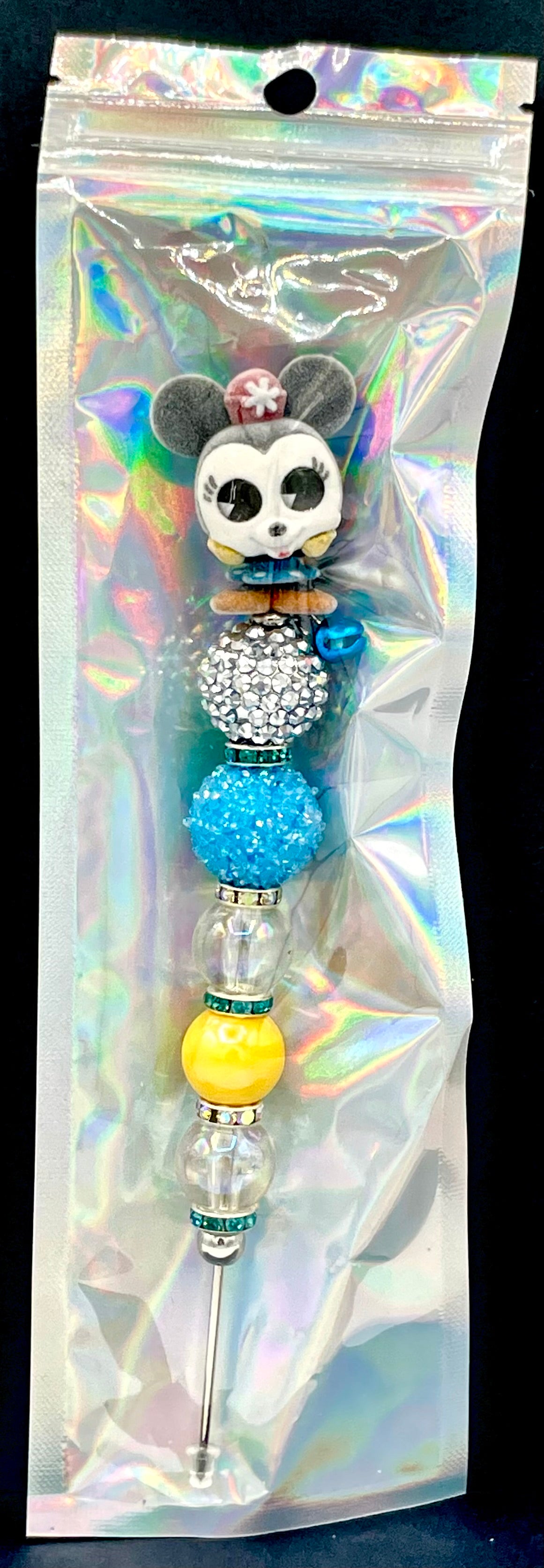 This poker is topped with a fuzzy Minnie Mouse in her design from the 1940s in the Disney universe and coordinated with silver and blue sparkle beads as well as yellow and clear glass beads. She’s even adorned with a cute blue bell.