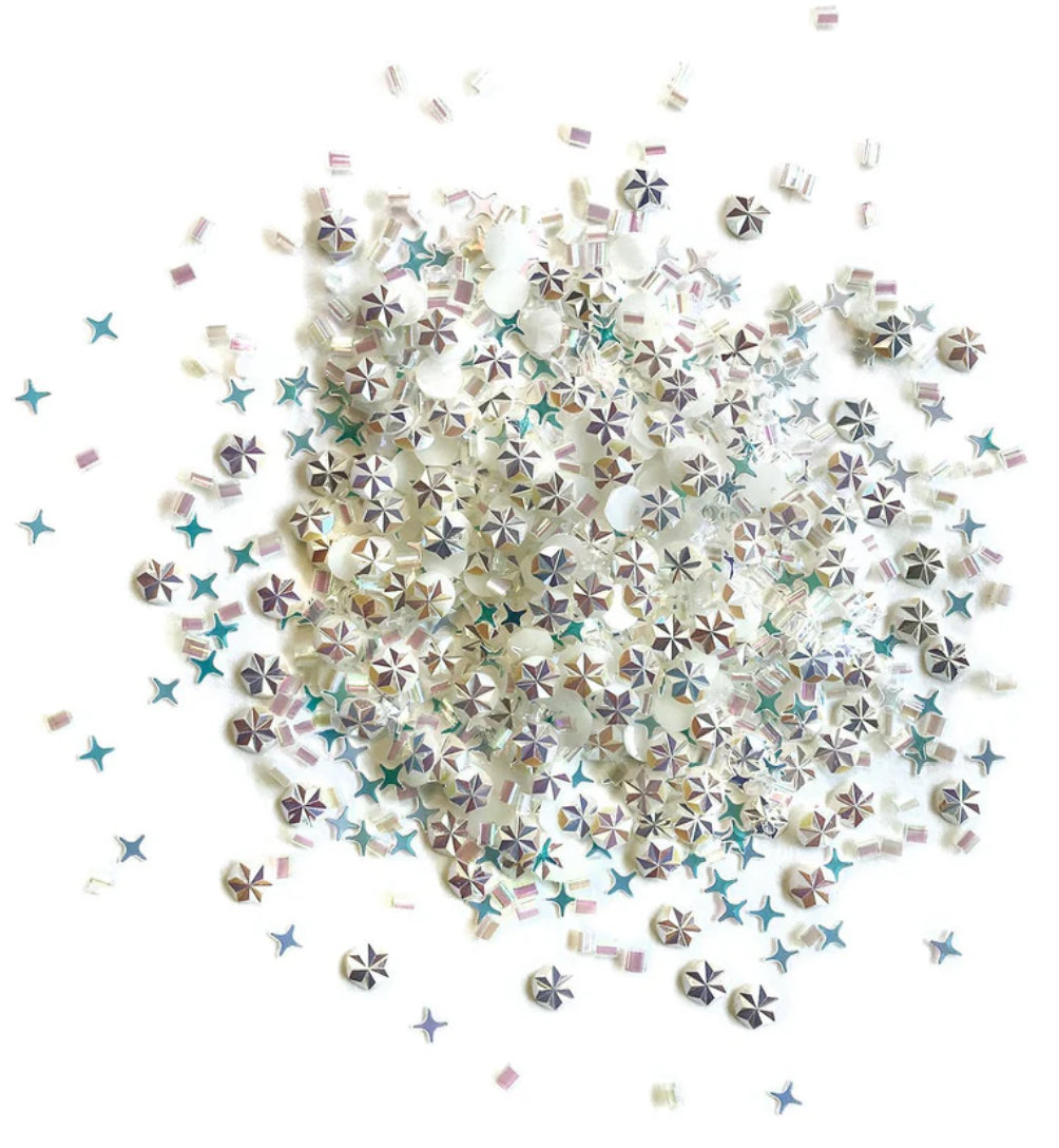Polar Wind is part of Buttons Galore & More's Winter collection of craft embellishments. These white mixes include iridesccent star shaped confetti, sparkling bugle shapes and assorted jewels for DIY crafting. The jewels are flat on the back and feature a textured top. Use them to embellish any craft project including scrapbooks, greeting cards, cell phone cases, finger nails or as shaker filler. You will recieve about 10 grams of product.