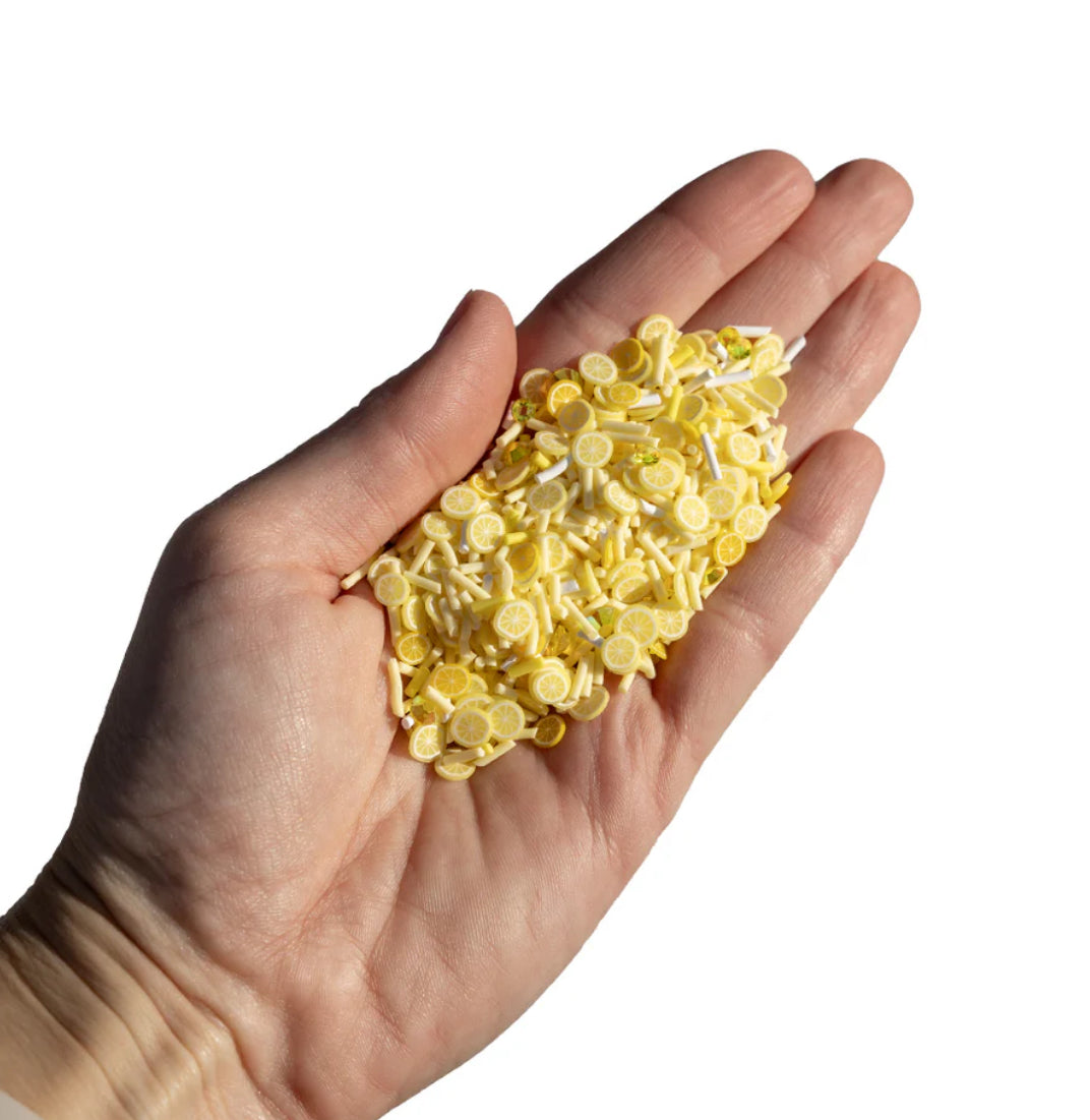 Lemonade Sprinkletz is a craft embellishment item from Buttons Galore and More's Sprinkletz collection. These tiny polymer clay embellishments are shaped like lemons and are perfect for adding a fruity twist to your projects.