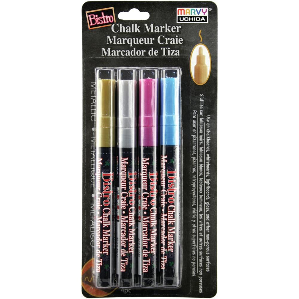 Creates a dustless, smooth layer and rich colors. Wipes away easily with a damp cloth. Use Bistro Chalk Markers on chalkboards, light boards, windows and windshields. They are opaque, water-based, pigmented and erasable when dry. This package contains four fine tip metallic chalk markers in Gold, Silver, Red and Blue. Conforms to ASTM D4236. Imported.
