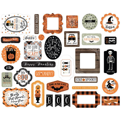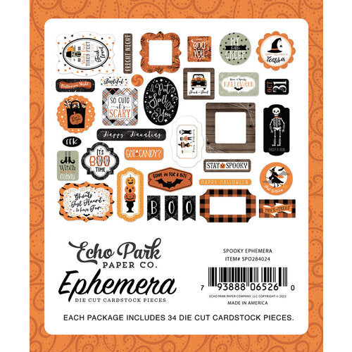 This package of 34 pieces of die cut ephemera is part of the Spooky Collection from Echo Park. These pieces include frames, banners, and label shapes with Halloween images and words and phrases used throughout this collection. These pieces can be added to cards, scrapbook pages, tags, journals, planners, art journals, and other paper crafting and mixed media projects. This package of ephemera is made in the USA.