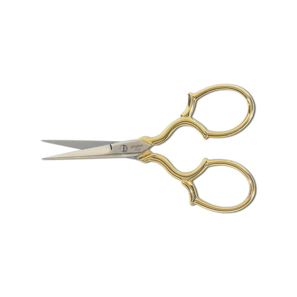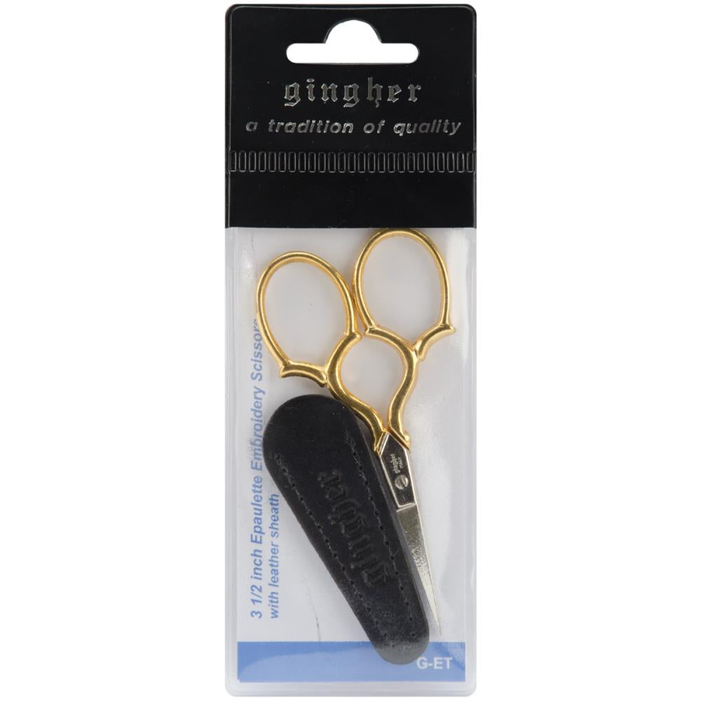 GINGHER-These embroidery scissors have been finished with needle sharp points and precision edges for the most intricate embroidery applications. Includes a fitted leather sheath. Feature nickel-plated blades and gold-plated handles. Measure 3-1/2". Imported.