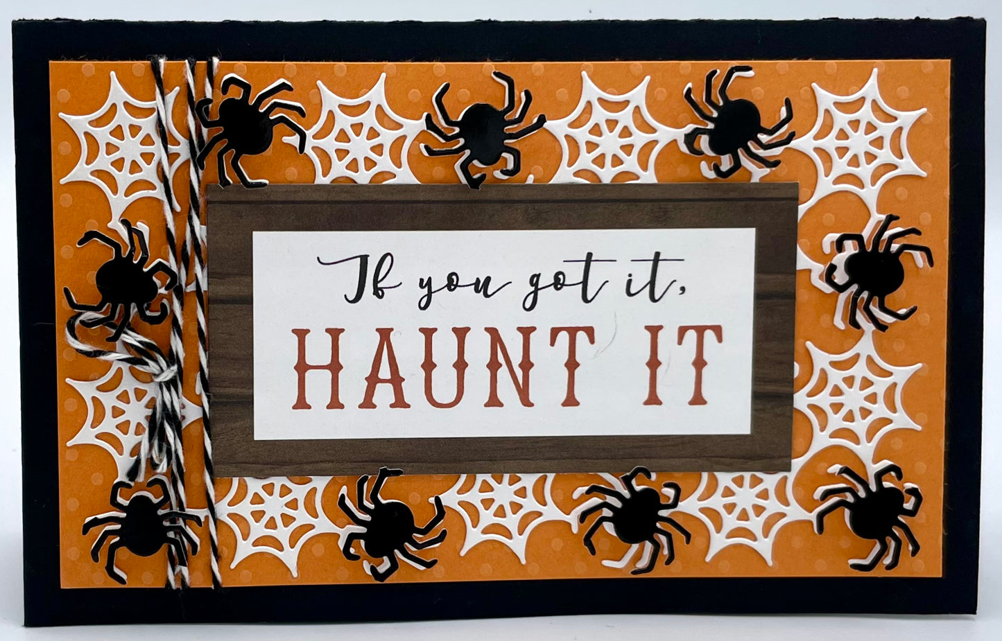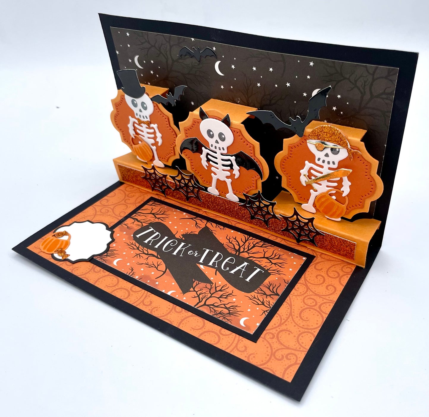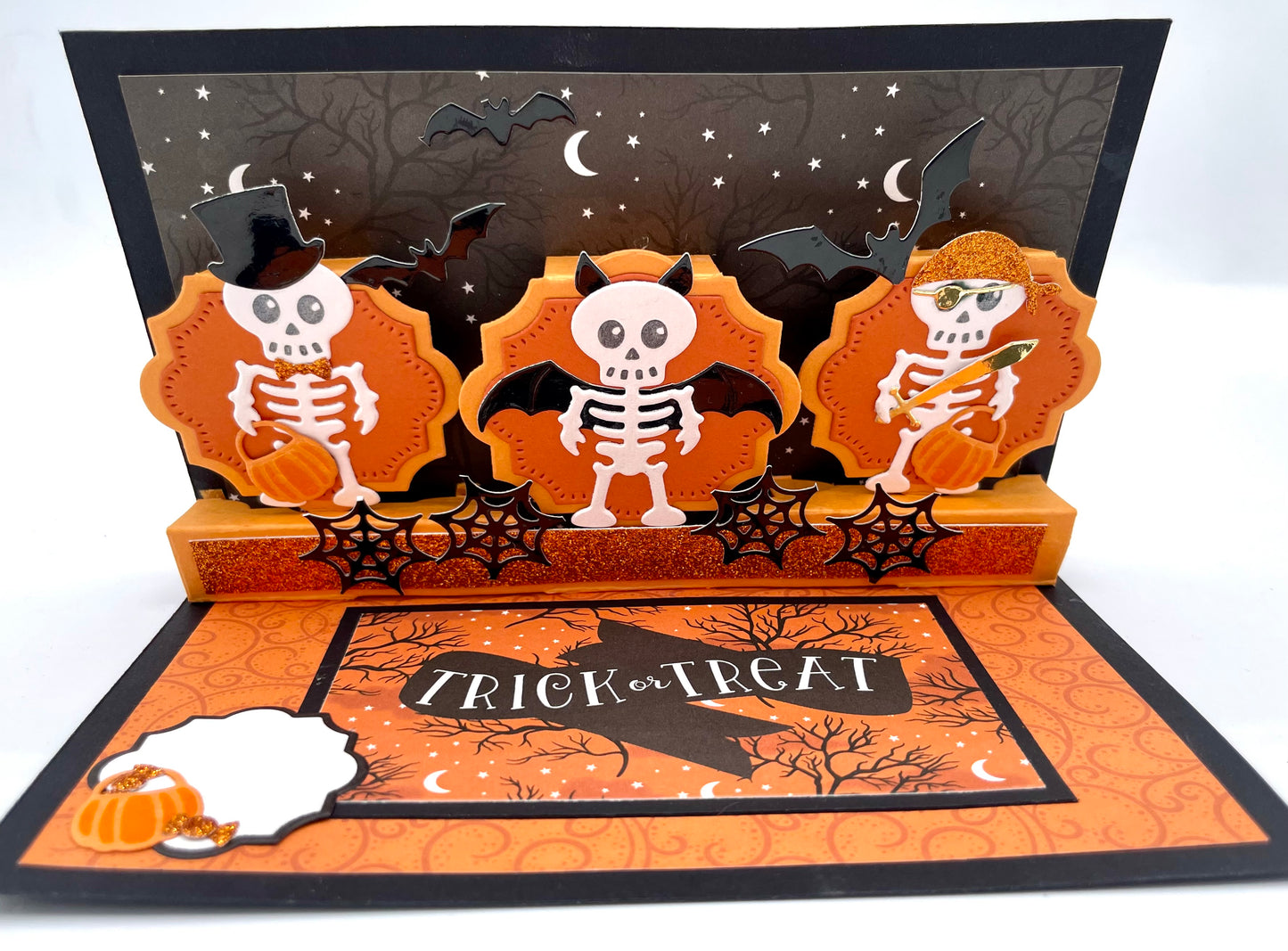 Gift this funny card to a friend or loved one this Halloween season as an exciting way to say “Trick or Treat!”. Featuring spooky spiders, silly skeletons and little pumpkins; this card has it all! From the mind of Karen Burniston comes this kit that comes fully loaded with all the papers, accoutrement, embellishments and more you need to make this card. Supply a few basic scrapbook crafting supplies and some Karen Burniston dies and you’re all set! Completed card measures 6 1/2”x 4” when folded.