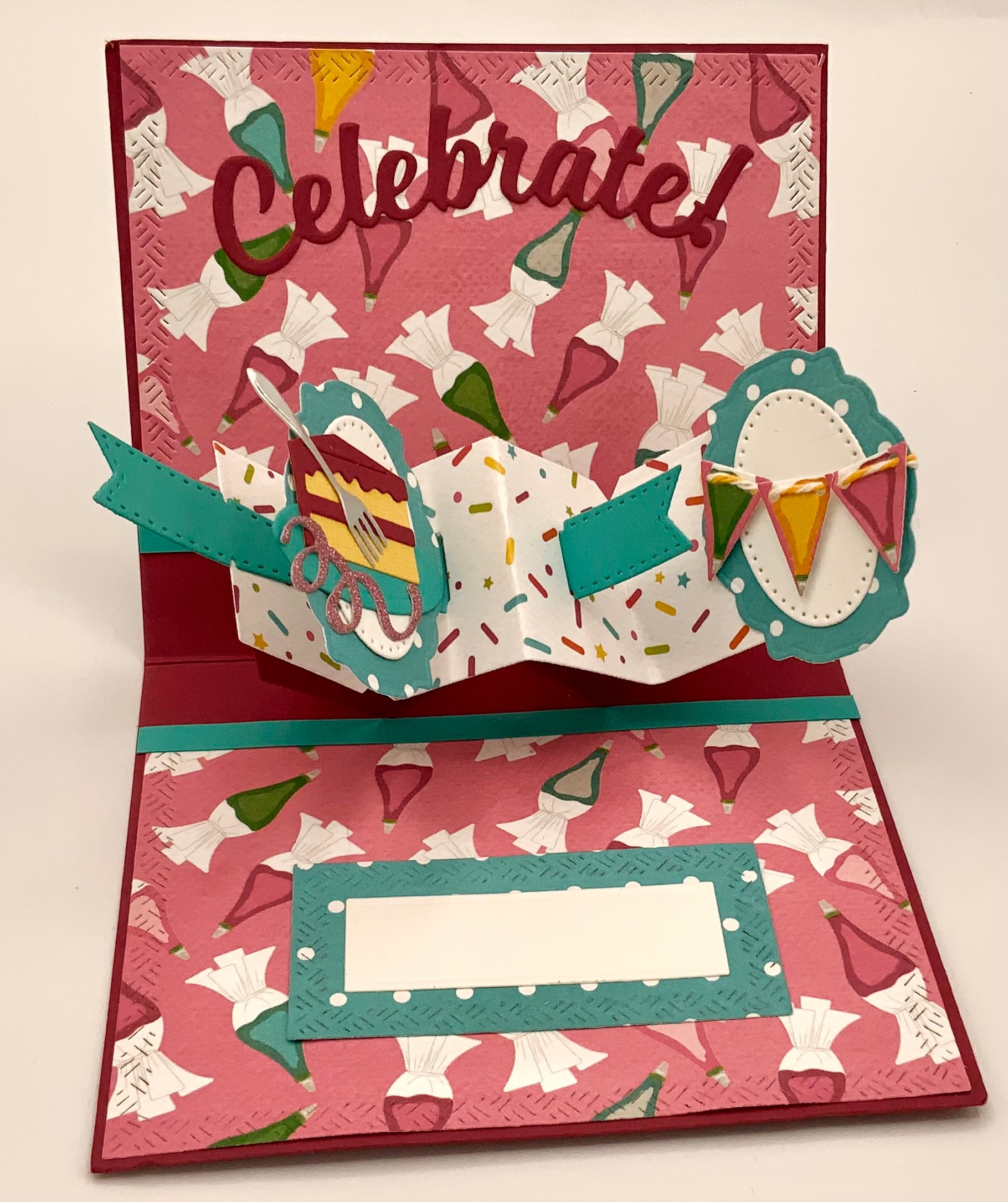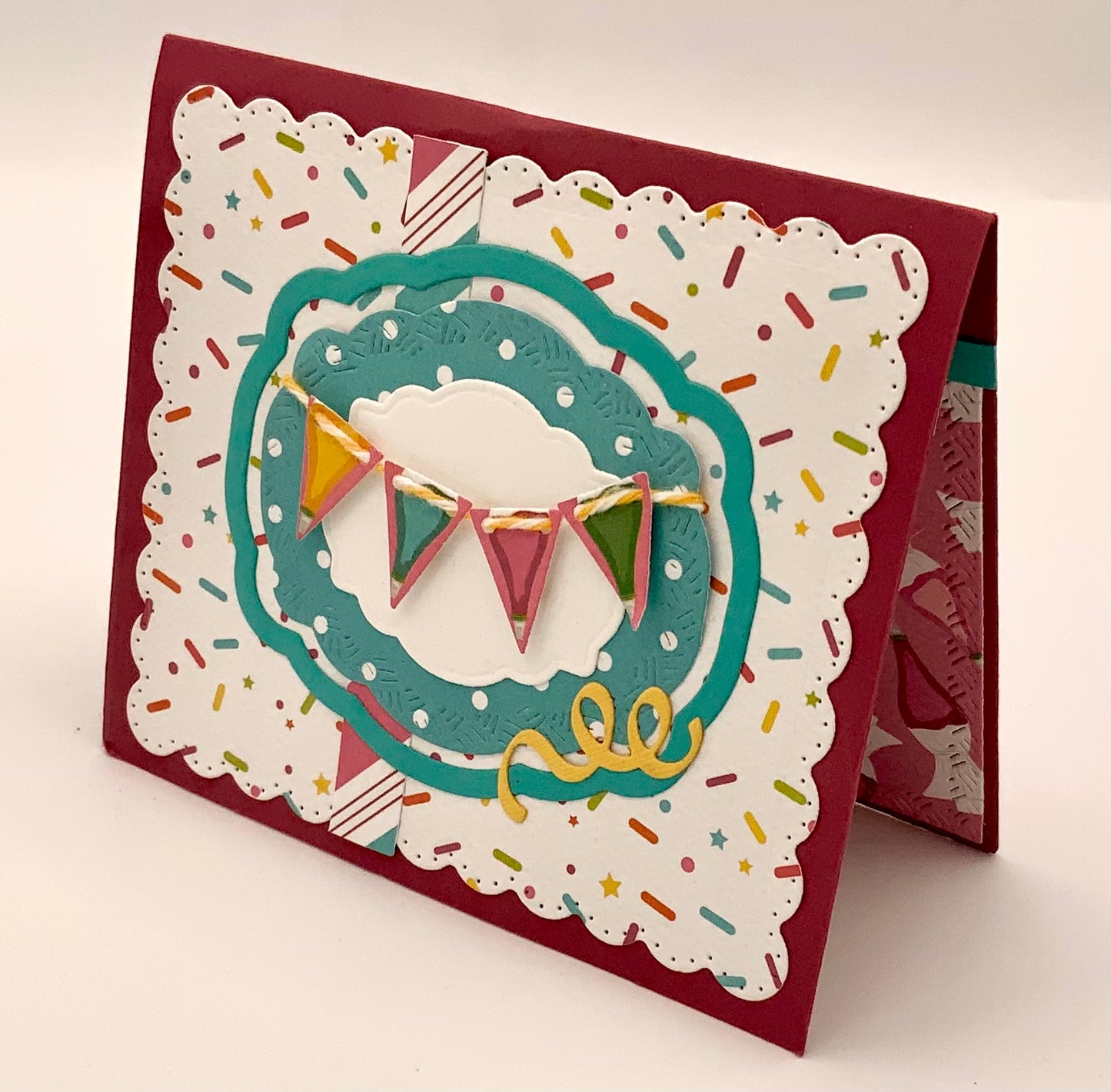 Make this perfect birthday card for a friend or loved one! This card features a simple banner on the front where additional customization can occur with an inside twist pop-out that will dazzle the recipient! Designed by Karen Burniston, this kit contains the pieces you will need to create this adorable card along with instructions. Card measures approximately 5”x 4 1/4” when completed.