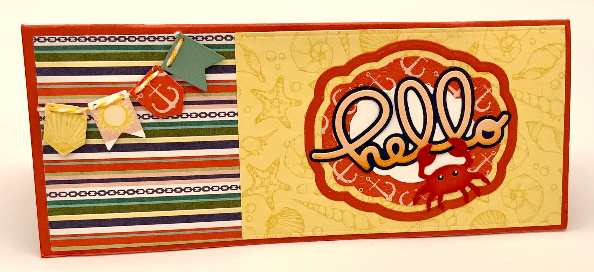 Learn to make this card designed by Karen Burniston! Featuring a little crab saying “hello”, this card will make the perfect “thinking of you” for friends and family members. Kit contains paper needed to create this card, with the “hello” sentiment pre-cut and how-to instructions. Completed card measures 8 1/2”x 3 1/2” once completed.
