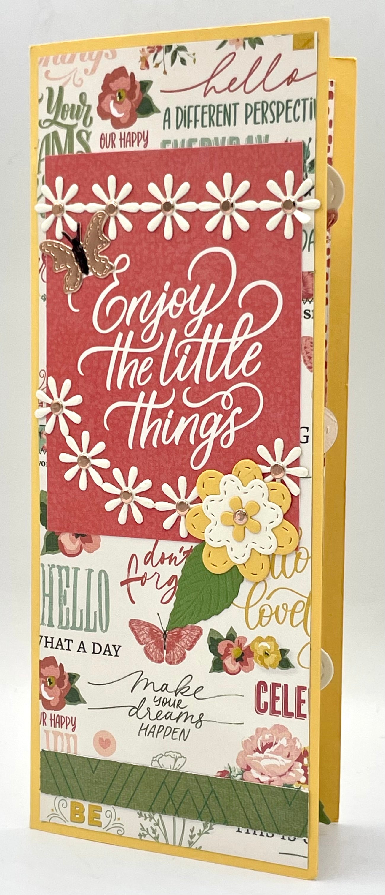 From the inventive mind of Karen Burniston comes this beautiful card filled with flowers…with a twist! The card opens revealing three flowers which delicately twist to pop up. Embellished with The Paper Cut Mirricard paper and PhotoPlay collections, you can confidently create and gift this card to a special loved one in your life. Kit contains all the paper you need and pre-cut circles for adding your own sentiment as well as clear instructions.
