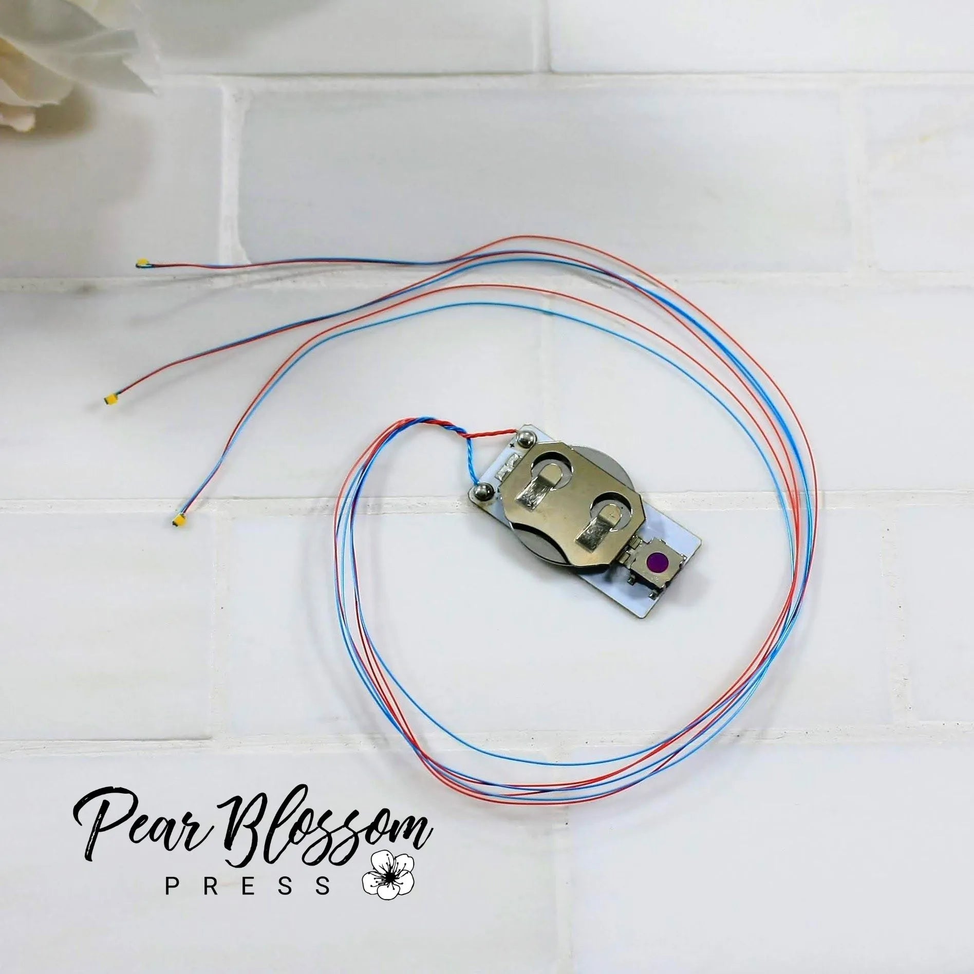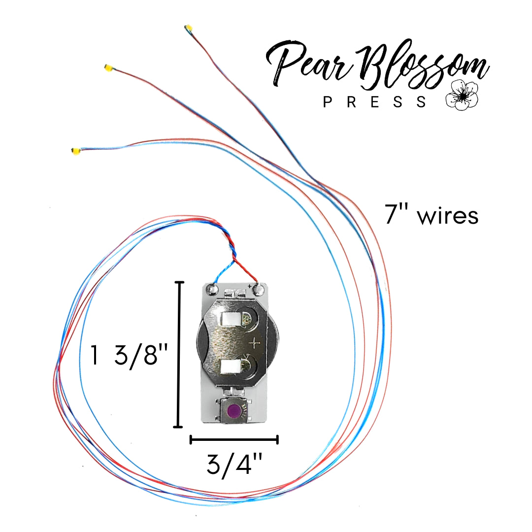 All-in-one light-up units with three warm white LEDs each, batteries included. These units have the lights already attached with long wires; no circuit building is required! To use, adhere the battery/switch in place. Glue or tape the LEDs in place. Cover with decorative elements, mark “push” over the button so the recipient knows how to turn the lights on.