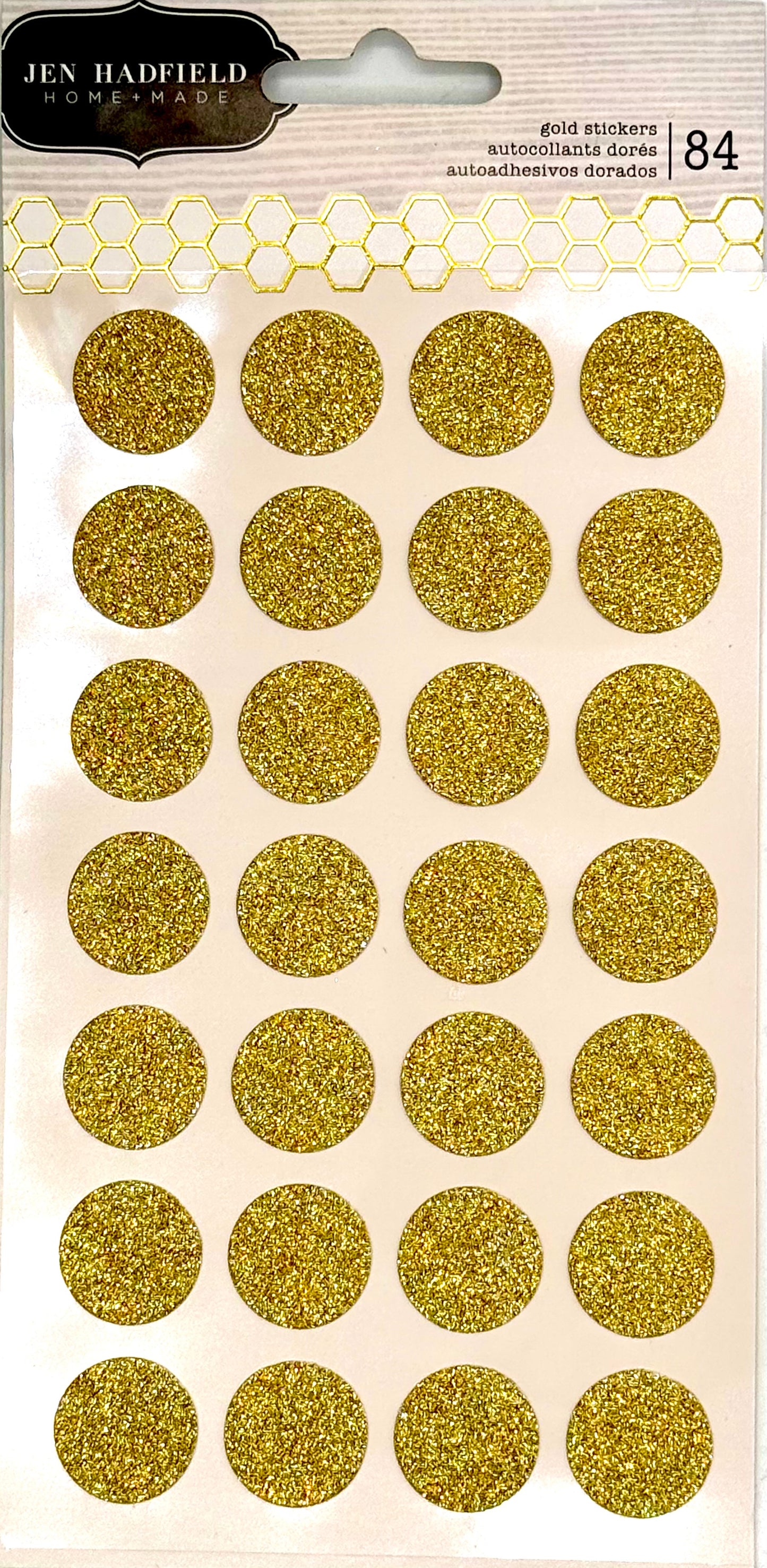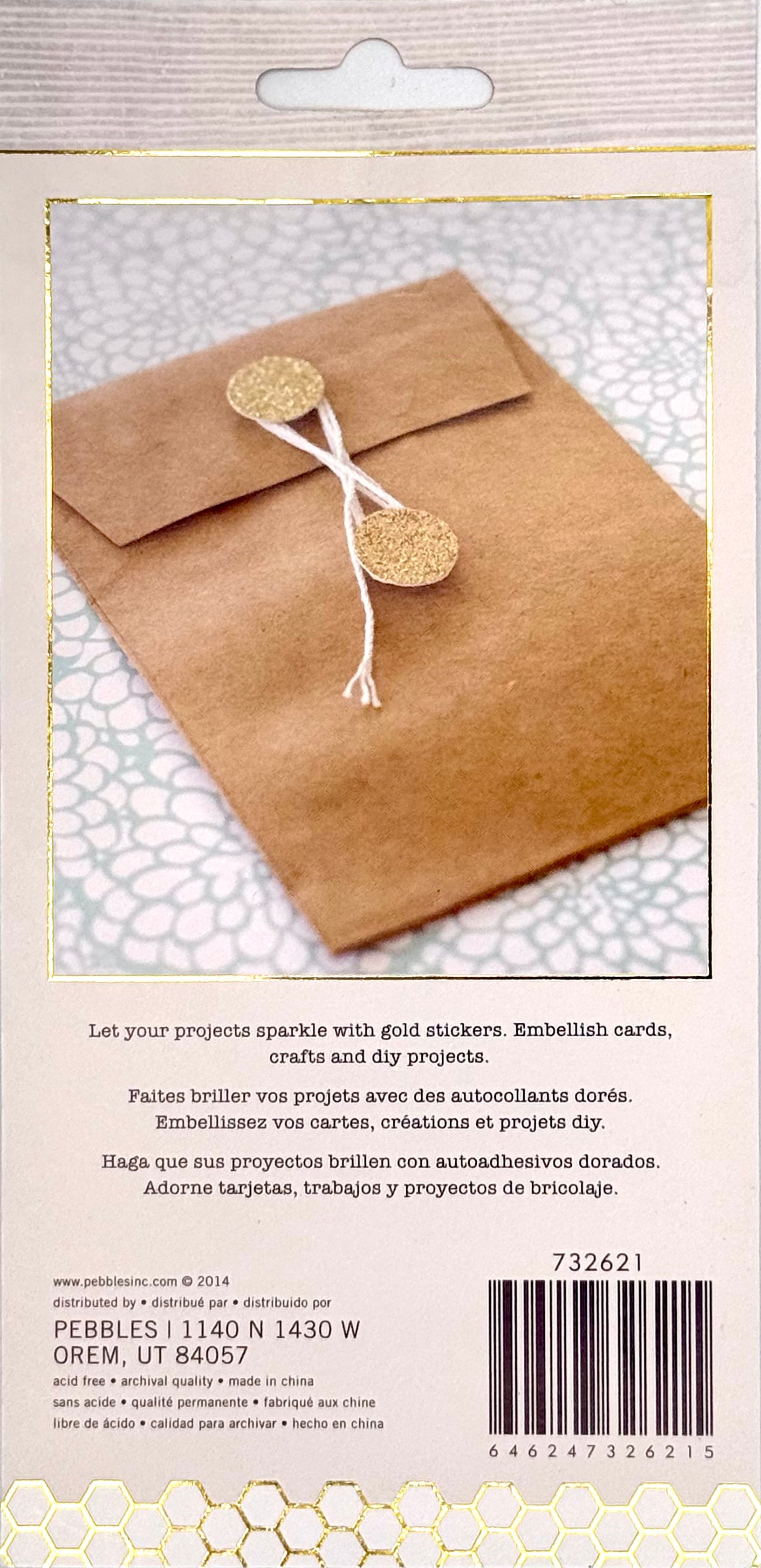 Add some sparkle to your crafts with Pebbles Inc's Gold Circle stickers. Made of cardstock with a glitter finish, these 3/4" stickers are perfect for adding a touch of elegance to your cards, layouts, and other craft projects. With 84 stickers in a package, you'll have plenty to go around!