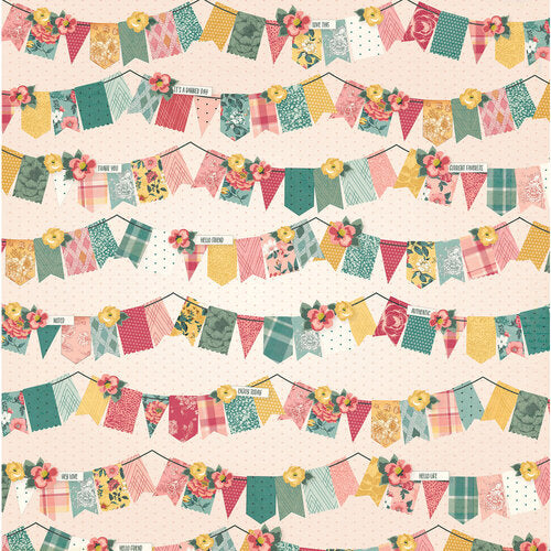 This 12" x 12" double sided paper is part of the Hello Lovely Collection designed by Michelle Coleman for PhotoPlay. The front side of this paper is filled with rows of banners in a variety of designs with small flowers on the banner strings. The reverse side is yellow and filled with light yellow flowers and buds. This paper can be used on cards, scrapbook pages, tags, and other paper crafting projects. This paper is both acid and lignin free. This paper is made in the USA.