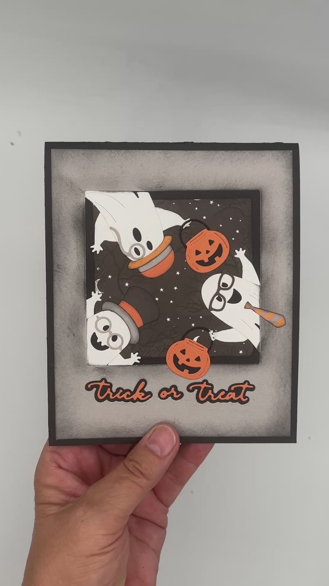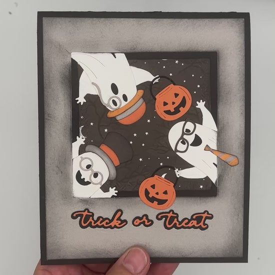 This spook-tacular handmade Halloween card is sure to bring a smile and a fright (the friendly kind)! The front of the card features a playful group of cheerful ghosts—our "Boo Crew"—dressed up with top hats, glasses, and pumpkins, floating against a starry night sky. Below them, the phrase "Trick or Treat" is boldly highlighted in vibrant orange lettering.