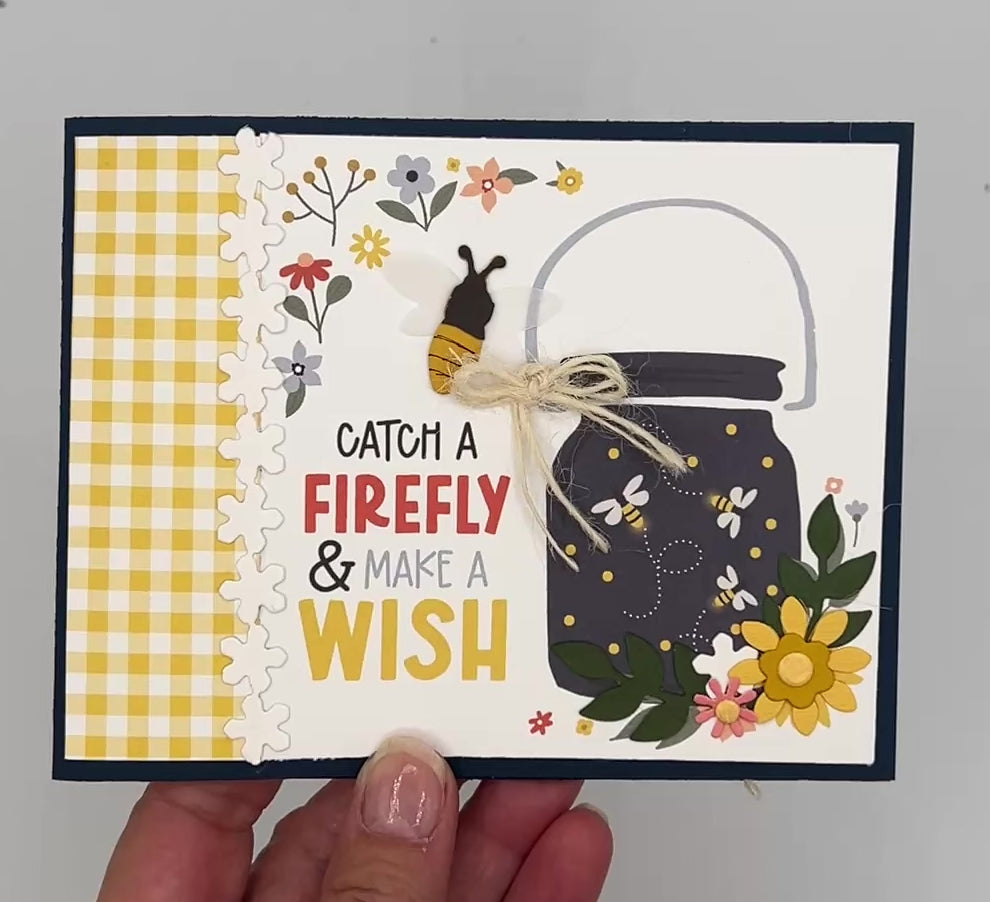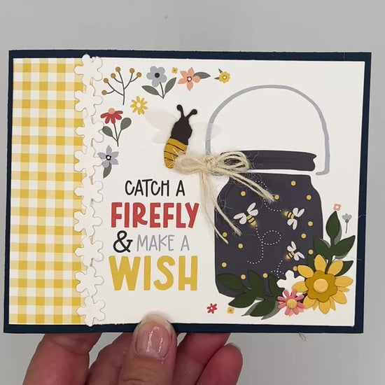 This handmade birthday card is bursting with summer charm and magical whimsy! The front features cheerful florals, gingham accents, and an adorable little firefly jar inviting you to dream big. Open it up to reveal a 3D surprise—a pop-up jar full of glowing fireflies and bright blossoms, bringing the warmth of a summer night to life. With a twine-tied lid and a sweet little "Press Here" button (for a glowing surprise!), this card is sure to light up someone’s special day. The back offers space for a heartfelt message framed by buzzing bees and blooming flowers. Perfect for anyone who believes in wishes, wonder, and a little birthday magic!