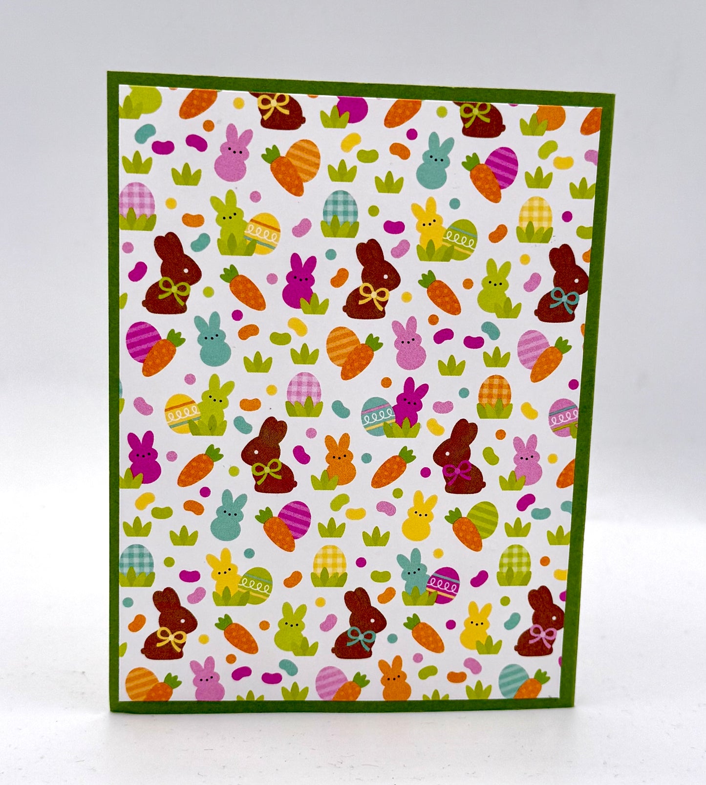 This ultra cute and adorable card Kit is perfect for sending to friends or family during the Easter season. The front features an Easter basket with eggs and a little chick with the sentiment “hello”. When you open the card, there’s a fun pop-up bunny holding a sign that says “Happy Easter” with the added sentiment “love you” underneath. The back has more patterned paper to seal the Spring vibe.