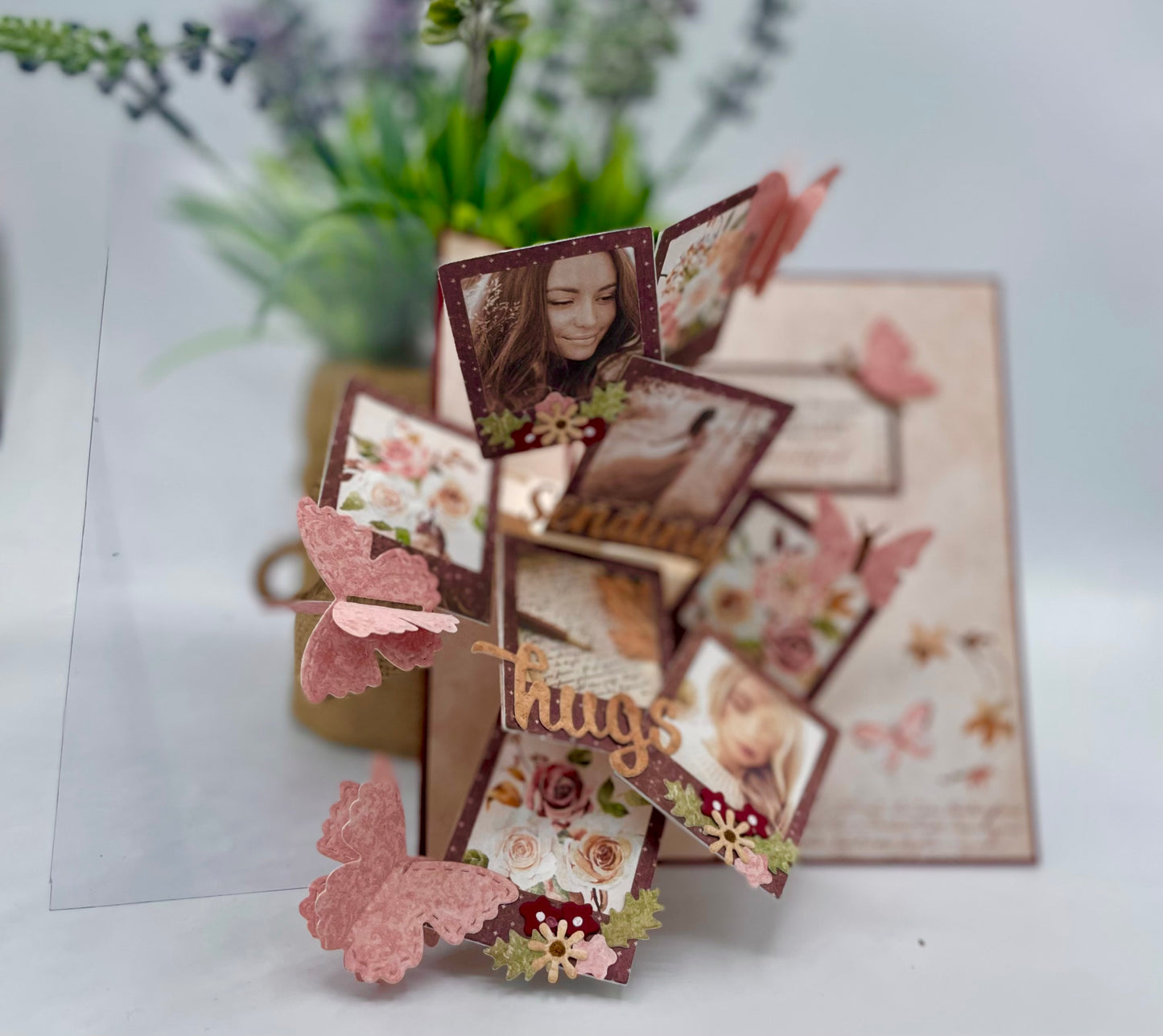 This stunning card is perfect for sending a little “hello” to a friend or family member that you’ve been thinking about. The front of the card is clear so you can see the butterflies, Hello message, and beautiful paper from Maja Design. When opened the pop-up mechanism displays photo holders, fluttering butterflies, and a sweet message “sending hugs” and sentiment “Autumn, the season that teaches us that change can be beautiful”.