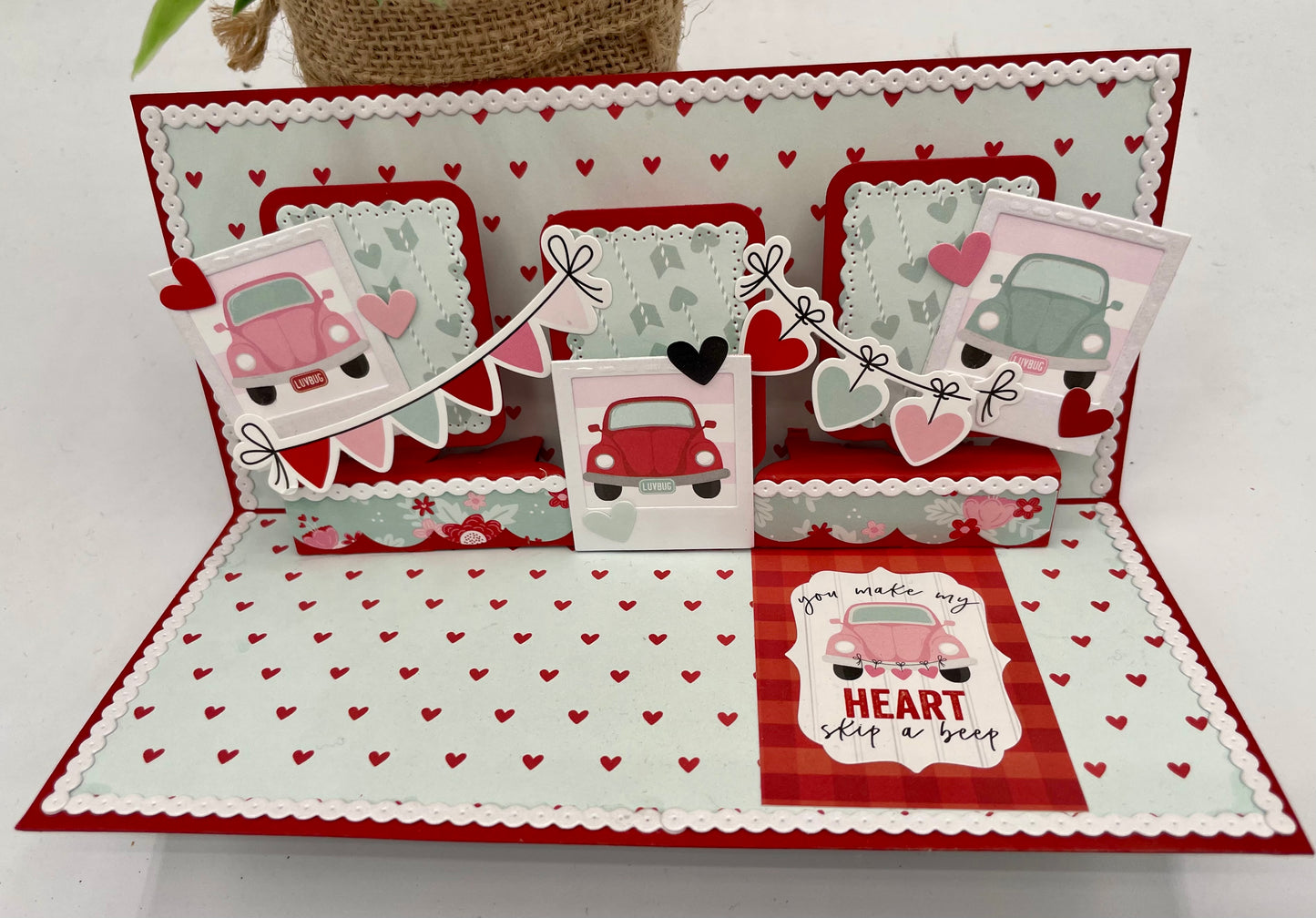 From the mind of Karrie Allen comes this ultra adorable Valentine’s Day card Kit featuring adorable love bugs! The front of the card has the words Happy Valentine’s Day alongside a cute Volkswagen. Inside combines some fun dies to create a pop-up trio with pictures of the framed Love Bug and embellishments from the Echo Park “Love Notes” collection. The back has plenty of room for you to write your own message to your loved one.