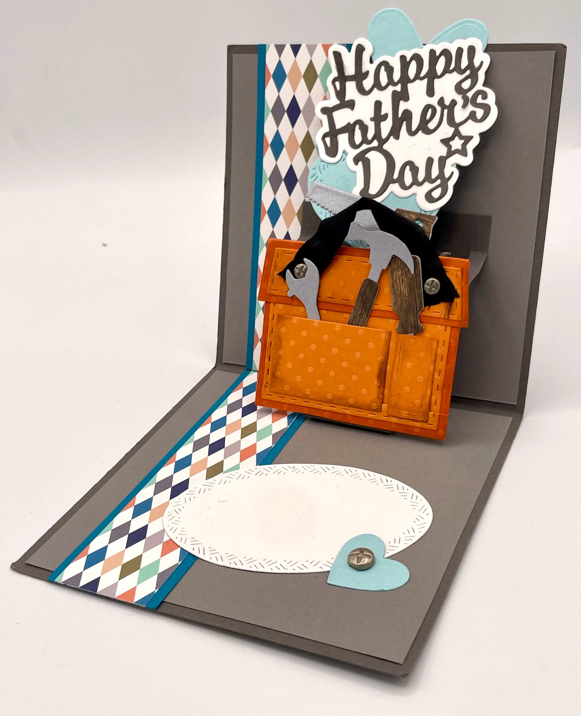 Gift this card made by your own hands to the father figure in your life! Featuring tools and masculine prints, this card will make your dad proud! The design inside has a tool box that you can embellish with a real ribbon handle. The sentiment folds inside to pop-up upon opening. This kit contains everything you need — ribbon, brads, pre-cut die pieces and pre-measured paper — so all you provide is adhesive and optional inks for distressing. Completed card measures 5”x5”. Instructions can be found on Scrapp’n Savvy’s Facebook page.