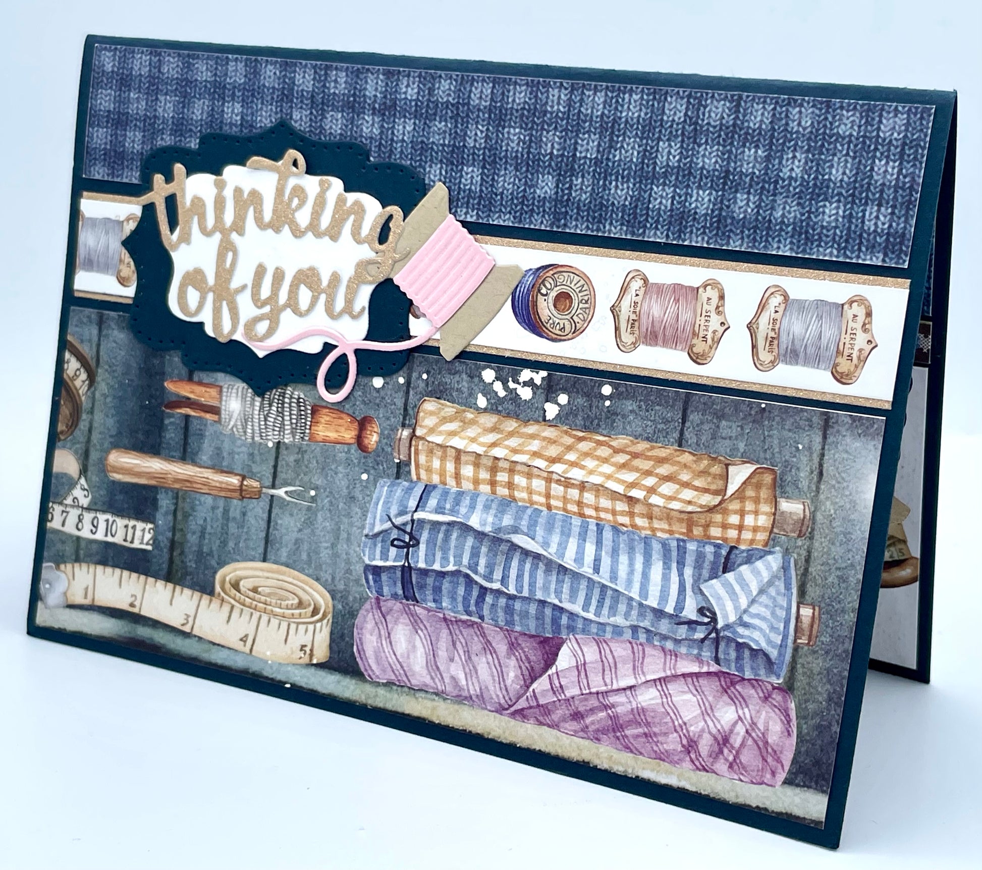 From the mind of Karrie comes this Thinking of You pop-up card with a unique sewing theme! In a beautiful deep cerulean blue with lots of thread, needles, bobbins and fabric embellishments the pop up feature is linked with love and twine! The sentiments explain how you’re thinking of your friend or family member with love.