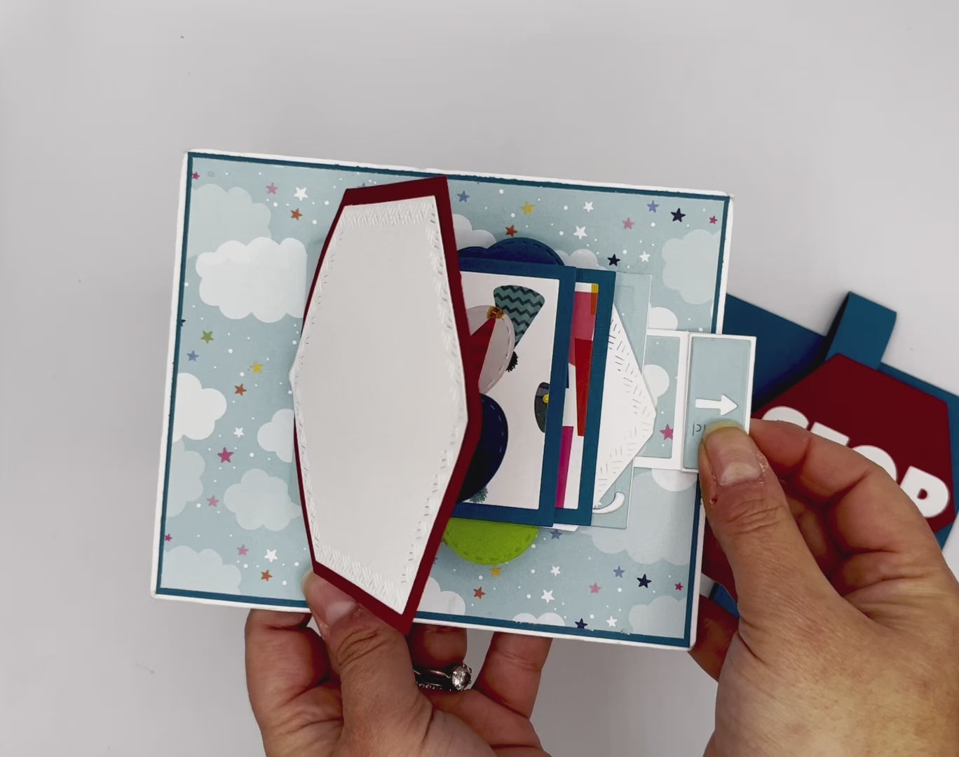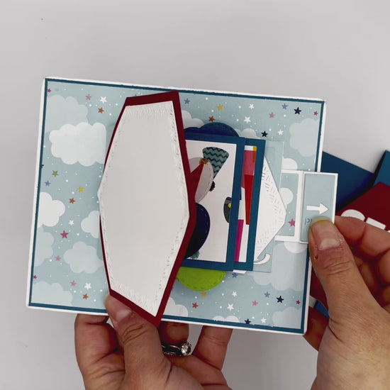Learn to create this card that features a band with a huge “stop” sign that pulls off to reveal the waterfall pull and pop-up mechanism. As you pull, you’ll reveal multiple layers of Happy Birthday designs with the sentiment “It’s time to celebrate happy birthday” and lots of balloons. The back features a blank area for you to add your own handwritten note to make it truly personal.