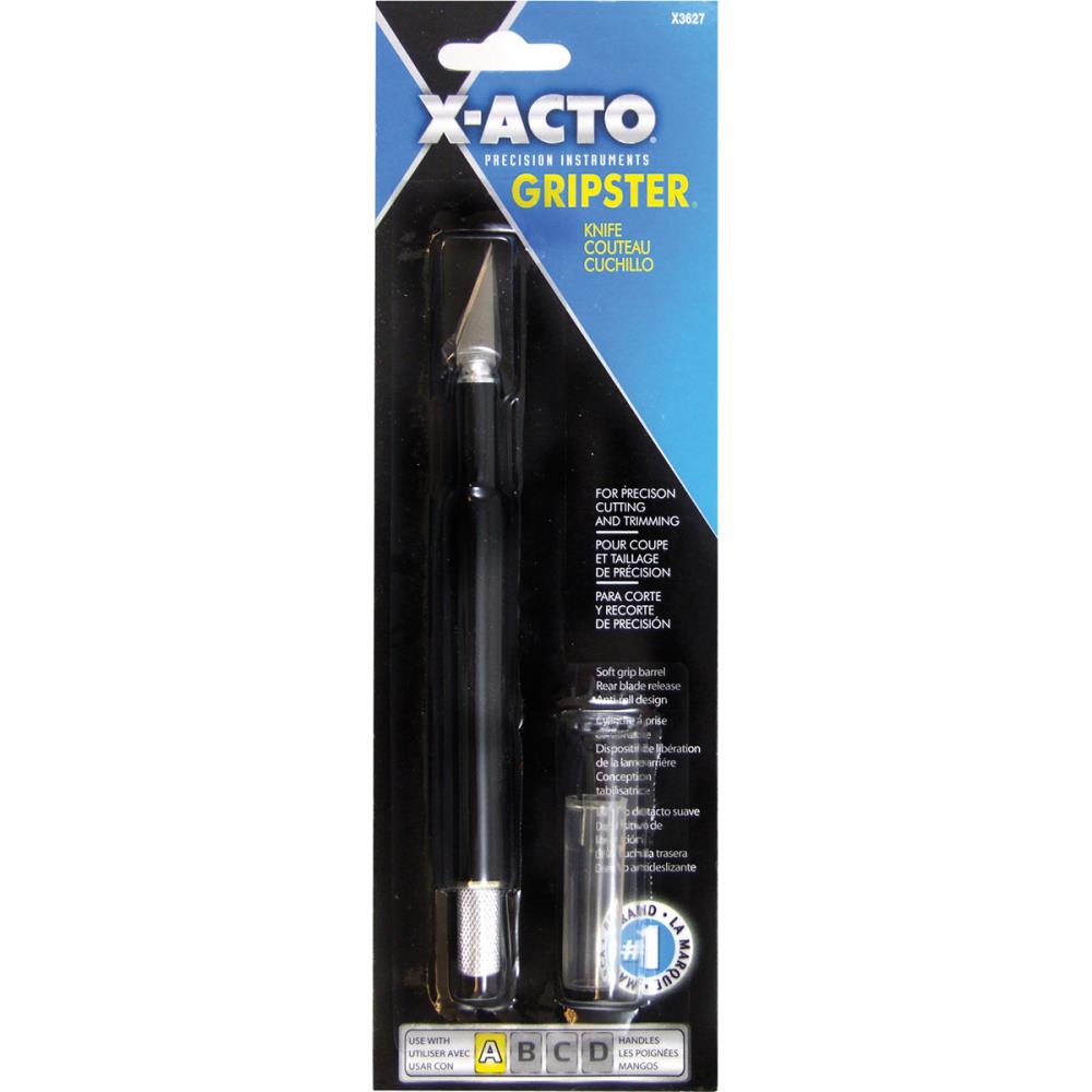 X Acto-Gripster Knife With Cap. Perfect for precision cutting and trimming! Features rubberized barrel for comfort and is designed to cut paper, plastic, balsa, thin metal, cloth, film and acetate. Knife has anti roll design and includes a classic fine point blade and comes with a safety cap for control. This package contains one 5-3/4 inch gripster knife with a cap. Imported.